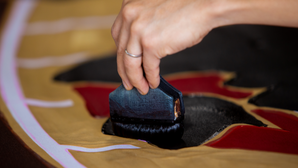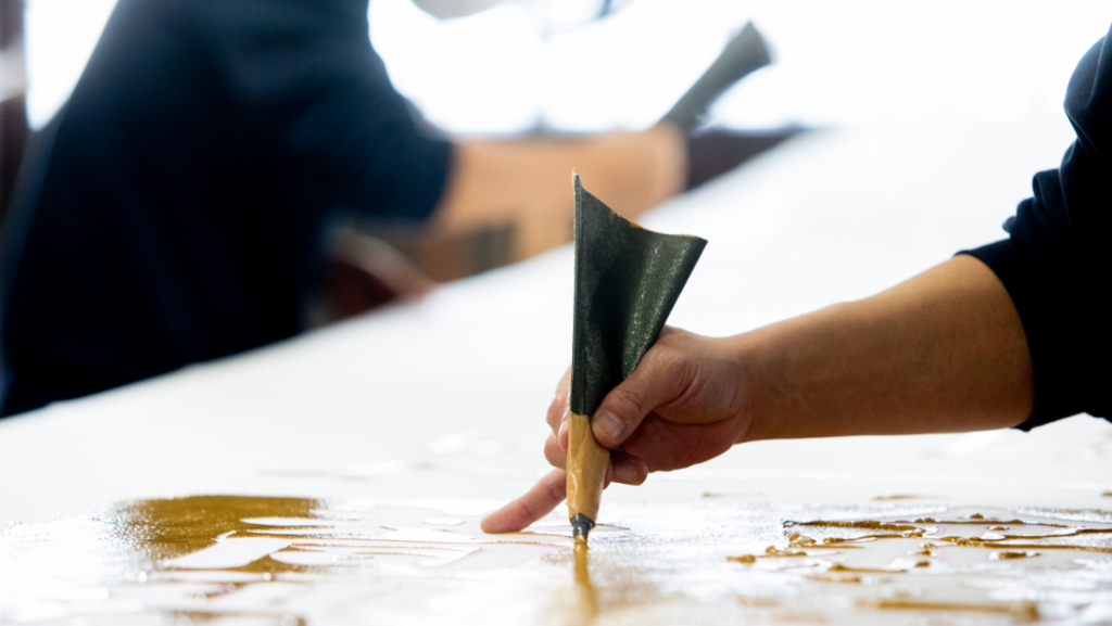 刷毛で染めるから、表も裏も等しい美しさに仕上がるのが特徴。手間暇惜しまず職人さんたちが染め上げるので、機械では決して出せない美しさなんだね✨