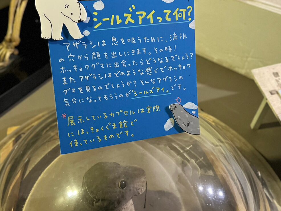 その中には、「シールズアイ」というホッキョクグマに出会った時どうなってしまうのか・・・その体感ができるカプセルも館内にあったよ!アザラシはその環境の中生きているんだね・・・。