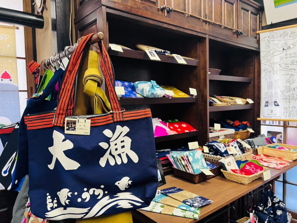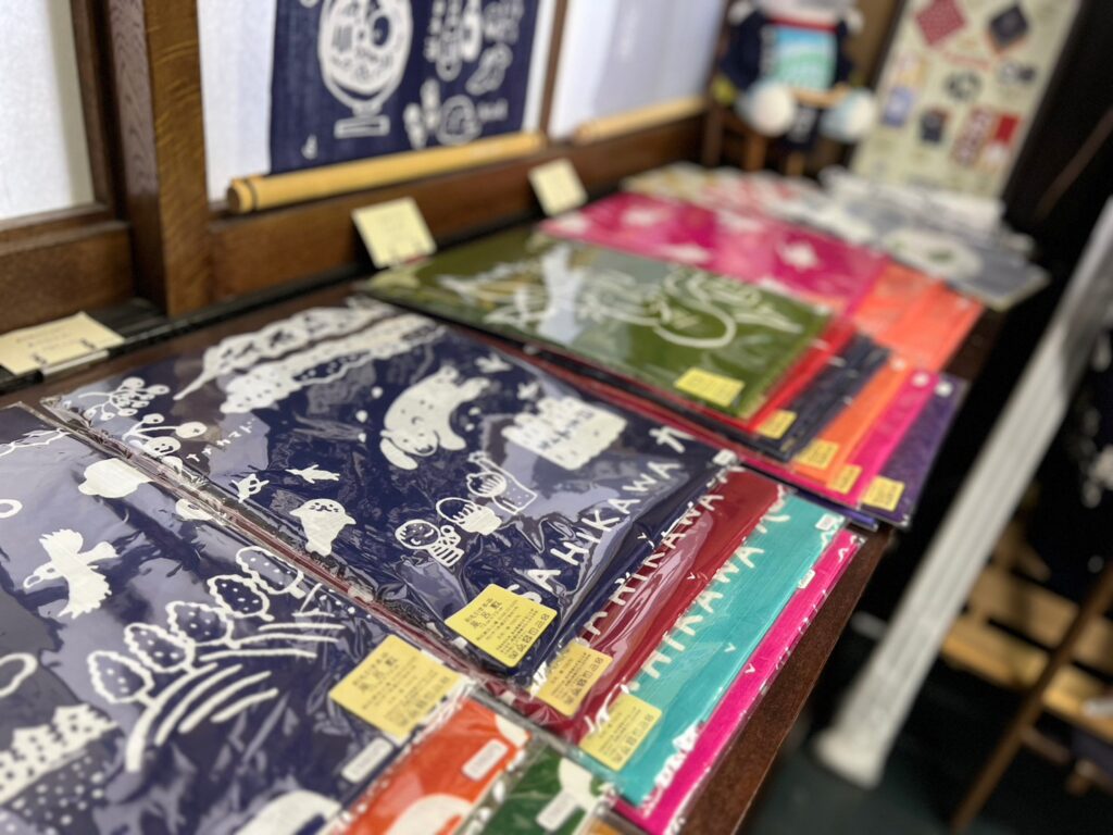 お店では、実際に鞄やエプロン、手ぬぐい、コースター、ティッシュケース等々沢山販売もされていたよ☆近藤染工場でしか作れない、ここに来た思い出にお土産としておすすめだよ♪