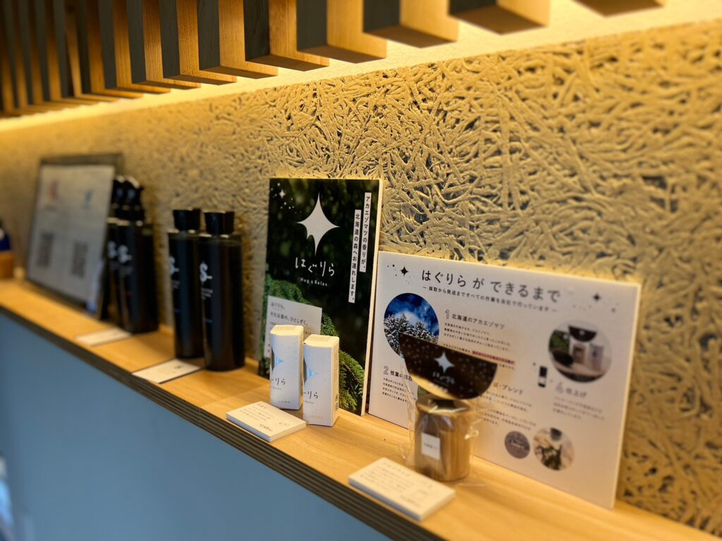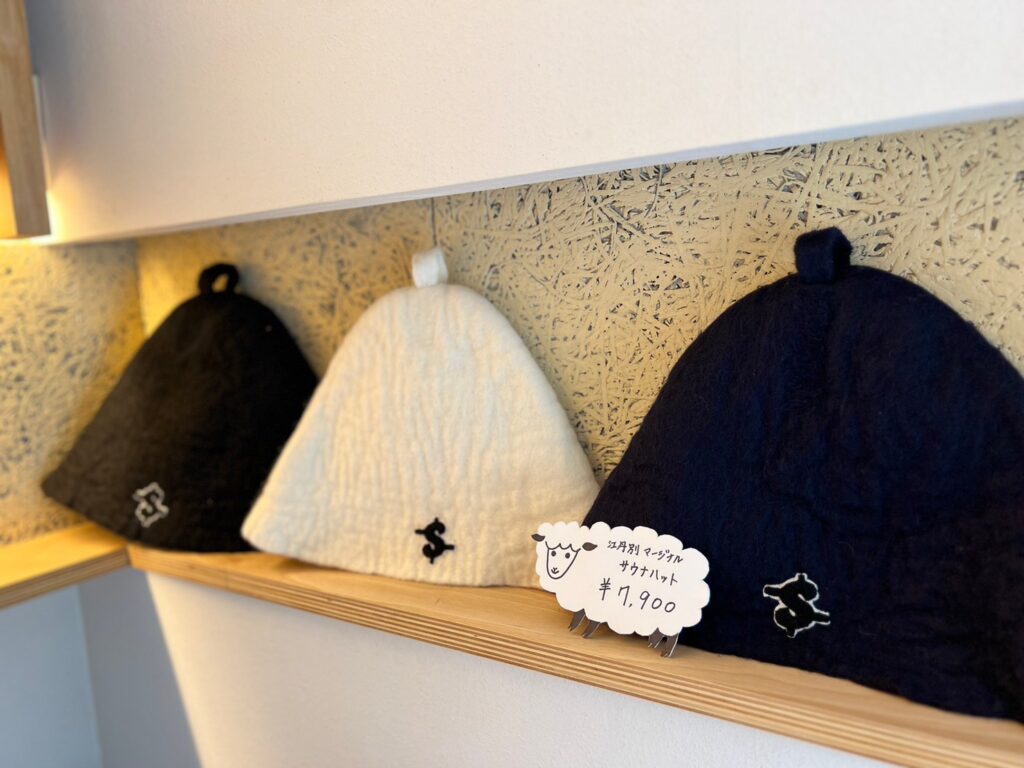 受付スペースも清潔感溢れる落ち着いた空間で!サウナハットや、ロウリュ水で実際に使用されている旭川産のアロマオイル『はぐりら』なども販売していたよ☆