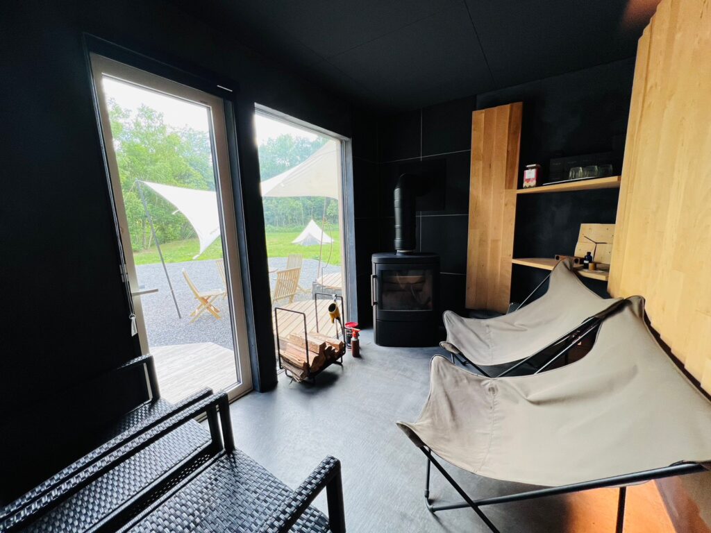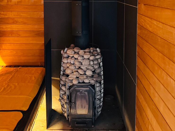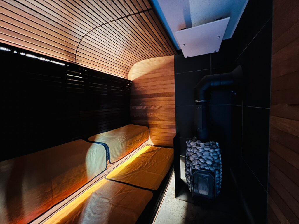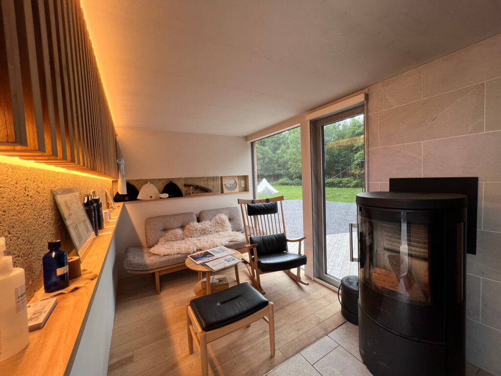 室内は、5名でちょうどいいサイズ!ストーブは、日本では珍しいエストニアの『HUUM』製の薪ストーブを使用しているんだって😲!もちろんセルフロウリュもできたよ♪