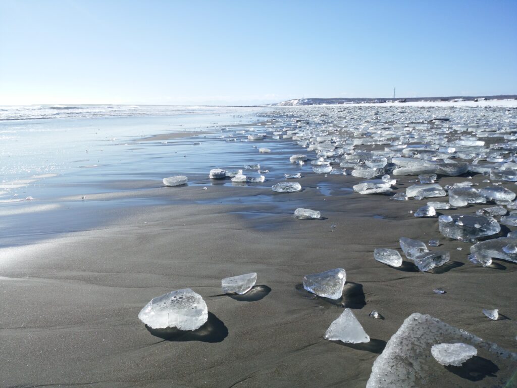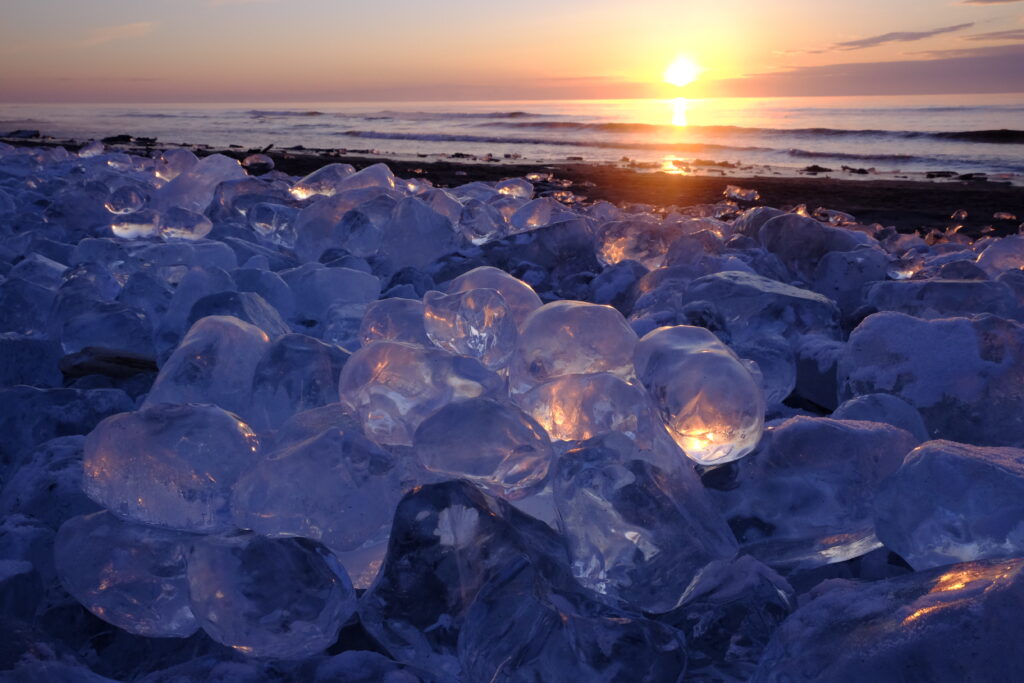 十勝の厳しい寒さが生み出す自然の神秘アイスジュエリー。流氷と似ているけど色が異なり、白い色をした流氷に対してジュエリーアイスはクリスタルのような透明色が特徴なのです。大津海岸周辺に打ち上げられる氷の塊が太陽の光を受けると、、とーっても美しい絶景になるのですっ!!