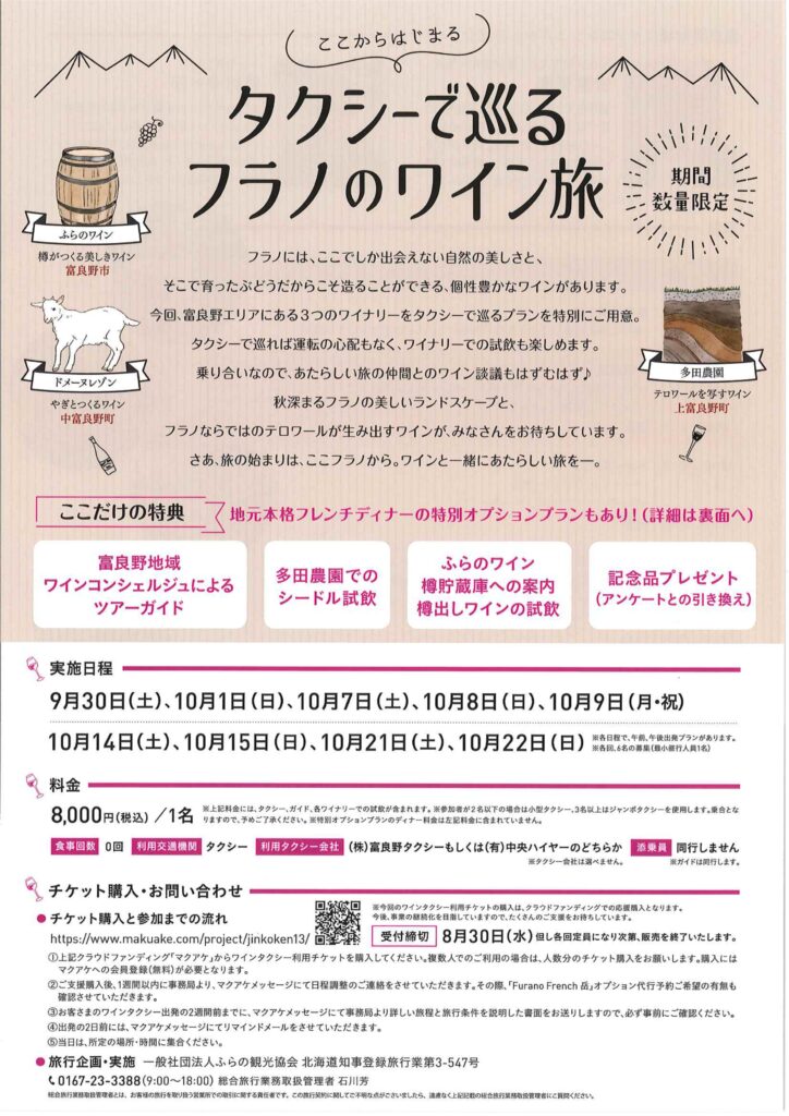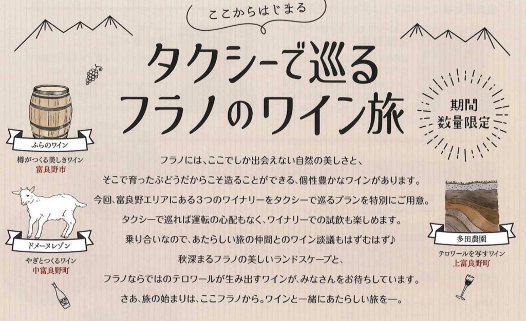 今回は、富良野盆地の恵みを受けた3つの個性豊かなワイナリーがある富良野で10月末までの土日祝日の9日間でフラノ地方の3ワイナリーをタクシーで巡る「タクシーで巡るフラノのワイン旅」プランが誕生したって聞いたので、参加してきたのですっ🍷