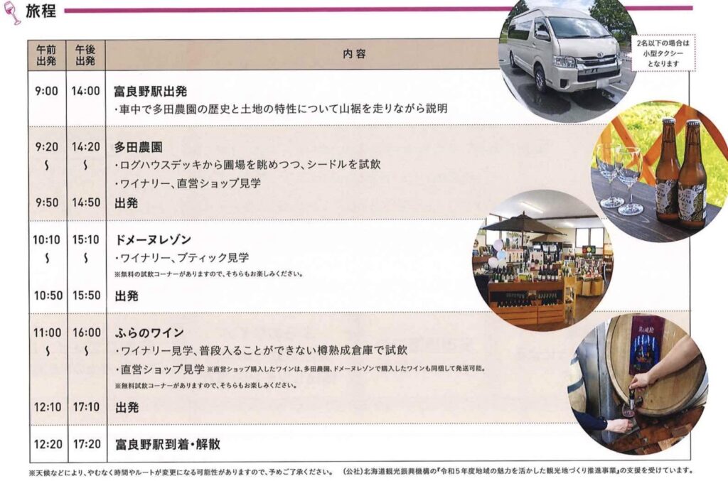 富良野駅で現地集合し、富良野エリアのワイナリー「多田農園」「ドメーヌレゾン」「ふらのワイン」の3ヵ所をタクシーで約3時間30分で巡るツアーだよ✨