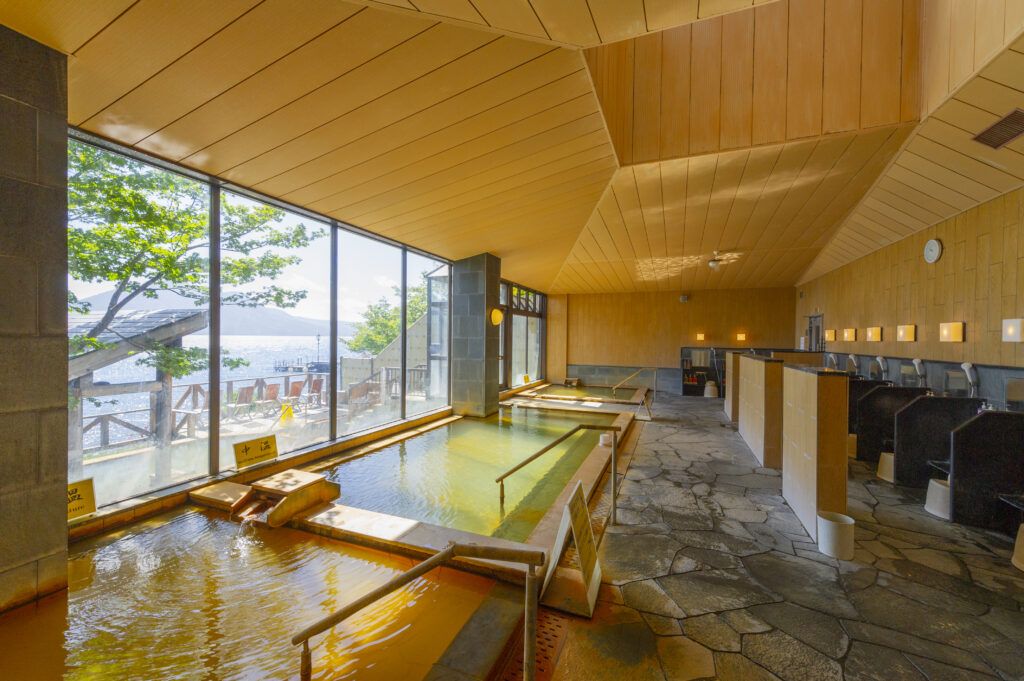 大浴場からも支笏湖を一望。お湯には塩分も含まれて、別名「熱の湯」。高齢者や病気回復期にも最適