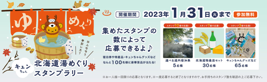 宿泊券など豪華商品が当たる!キュンちゃん北海道湯めぐりスタンプラリー実施中!