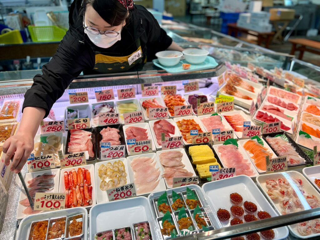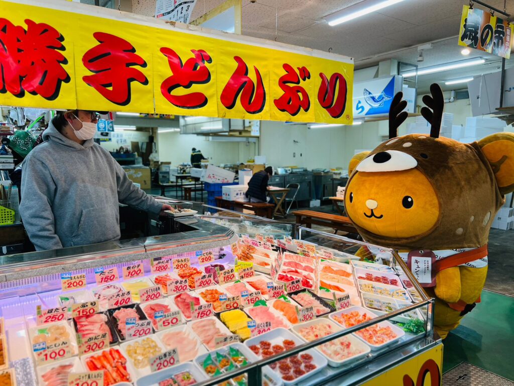 自分の好きなどんぶりに盛られた白ご飯に好きな魚介類を盛り付けて食べられる勝手丼が、釧路市内の「和商市場」さんで食べられます。JR釧路駅のすぐそばなのでアスクセスも便利なのです~♪