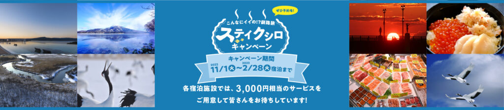 釧路市では、期間中、市内の対象宿泊施設をとってもお得に利用できる「ステイクシロキャンペーン」を実施します!キャンペーン対象の各宿泊施設では、3,000円相当のサービスをご用意して皆さんをお待ちしています!