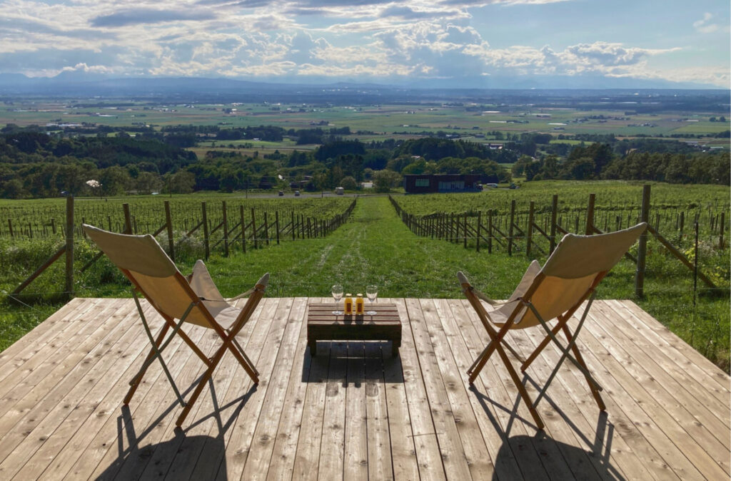 蒸溜所のスタッフさんに「ぶどう畑が広がる丘につくられた完全予約制のテラスがあるよ」って教えてもらったのです!目の前に広がる景色を見ながら、ワインやりんごジュースで乾杯♪