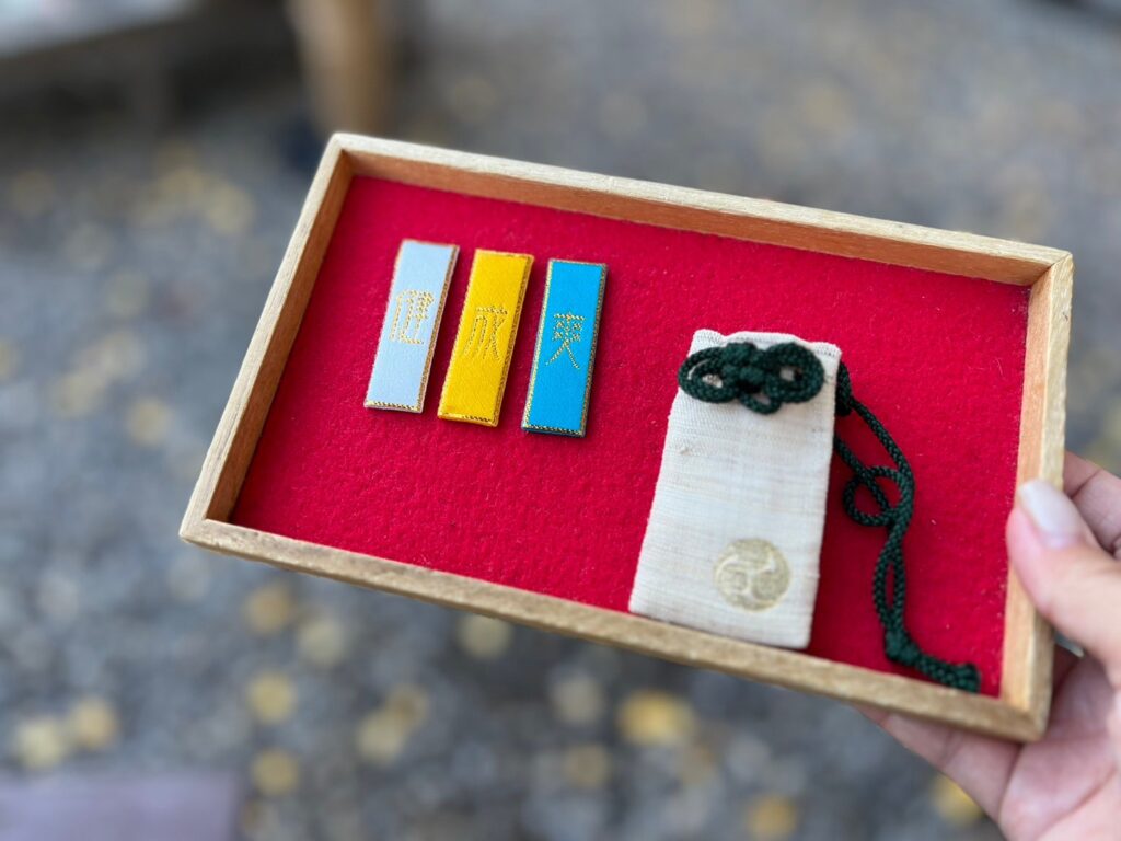 数種類の袋と紐の色を選べて、その中に内符を3つ選んで入れる事が出来るんだよ~!!内符は「成」や「恋」など全部で12種類✨みんなはどんな願いをお守りに入れる~?