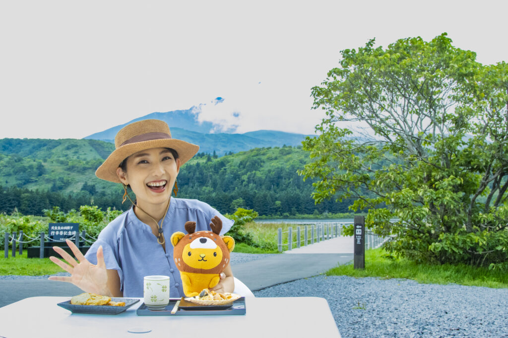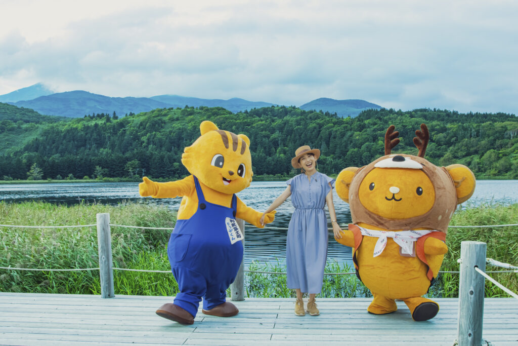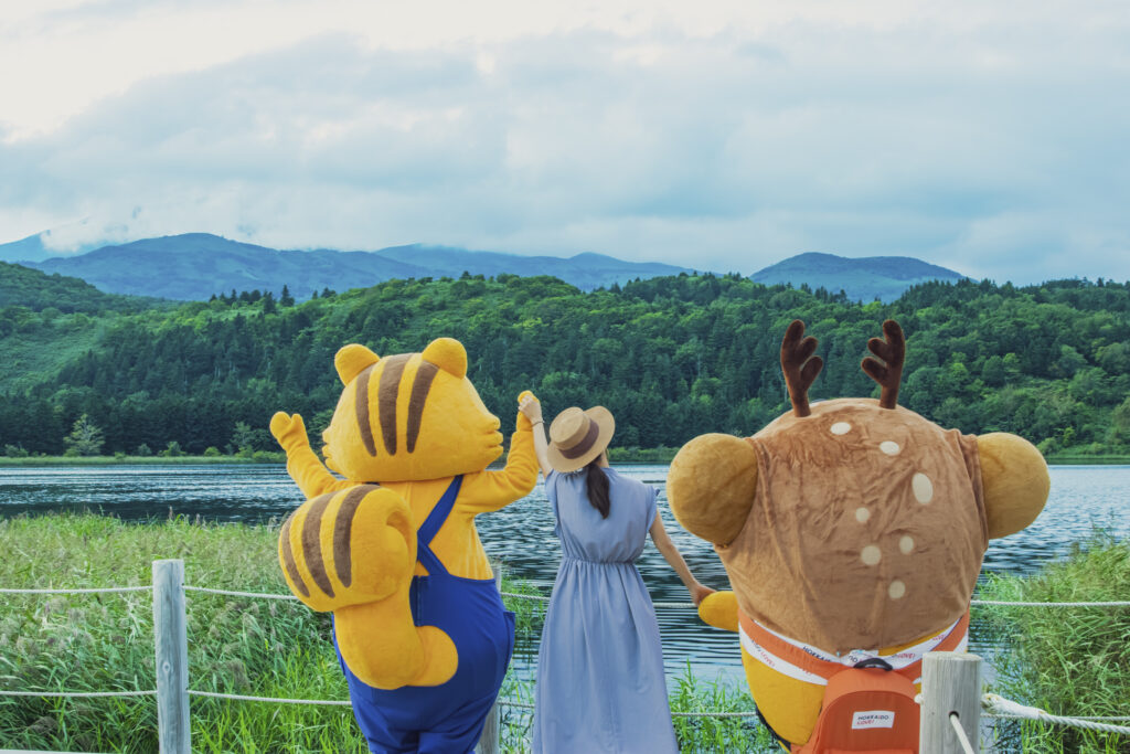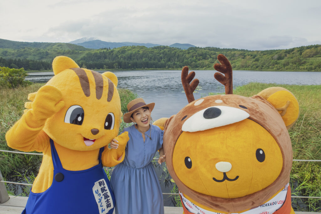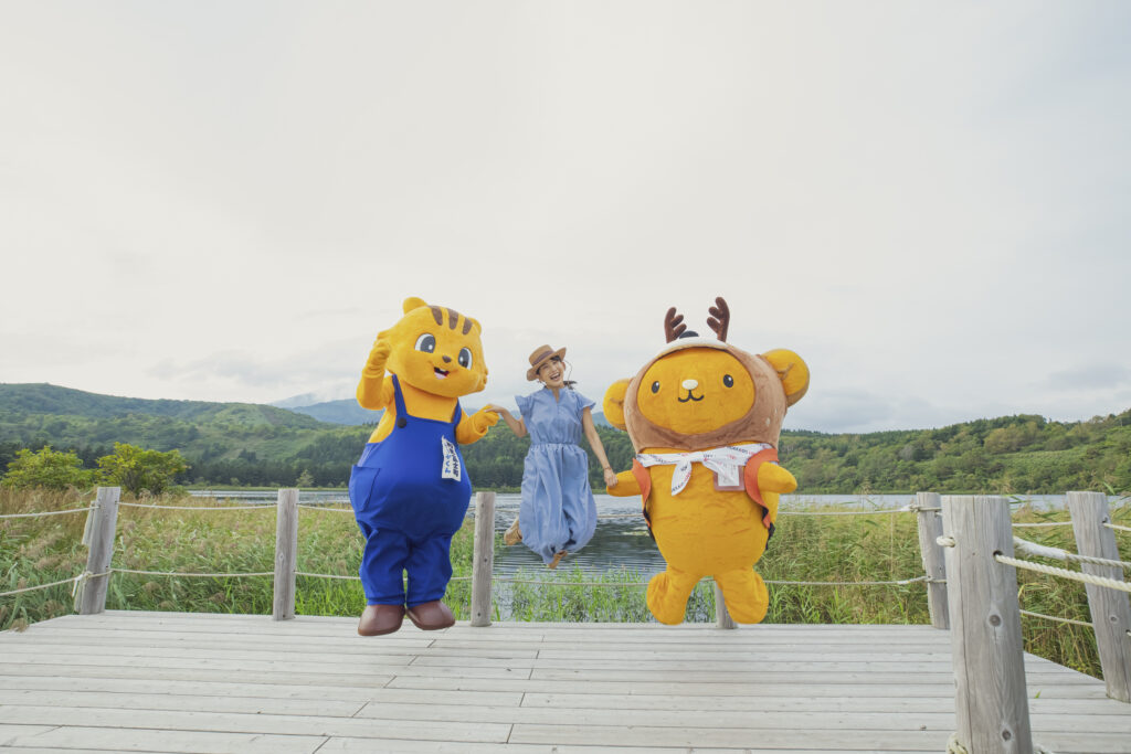 利尻富士町のマスコットキャラクター「りっぷくん」も来てくれて、りっぷくんとそらさん、3人でオタトマリ沼を楽しんだのです♪3枚目はみんなでジャンプして記念撮影してみたのです✨みんな、宙に浮いて楽しそう♡