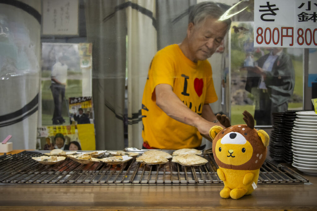 お店の外にあるテラス席で頂きますっ!!利尻山を見ながらプリップリのホタテ✨幸せ~!!