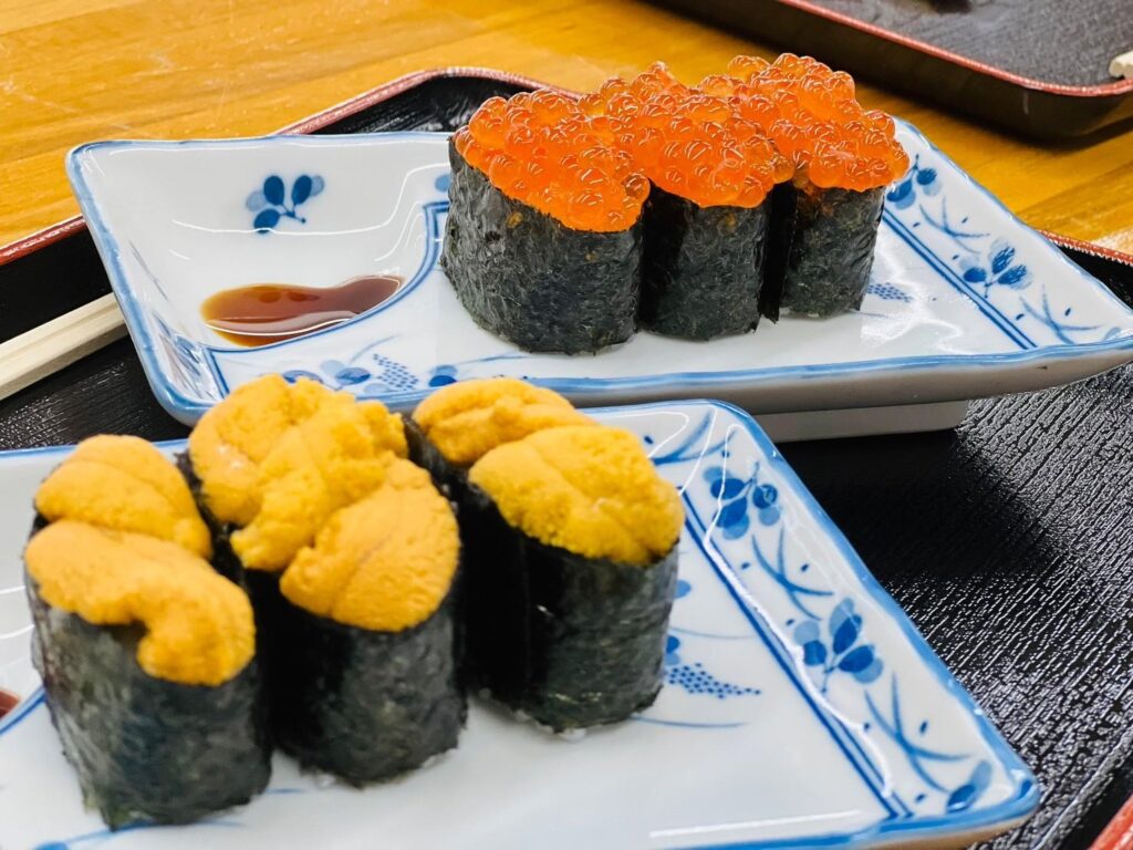 北海道といえば、やっぱりウニ♡”ウニ軍艦”と”いくら軍艦”を頂きます✨一つの軍艦に乗っているネタがとってもビッグサイズっ!!