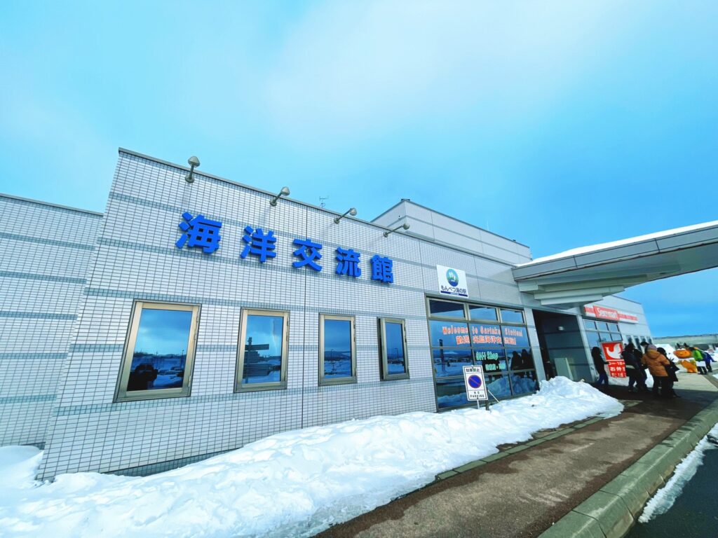 「ガリンコ号」の乗船場所はこちら「海洋交流館」!中にはフードコートがあってグルメがとっても充実。またお土産店や北海道のコンビニ「セコマ」もあるので、なんでも揃う場所なんだよ~