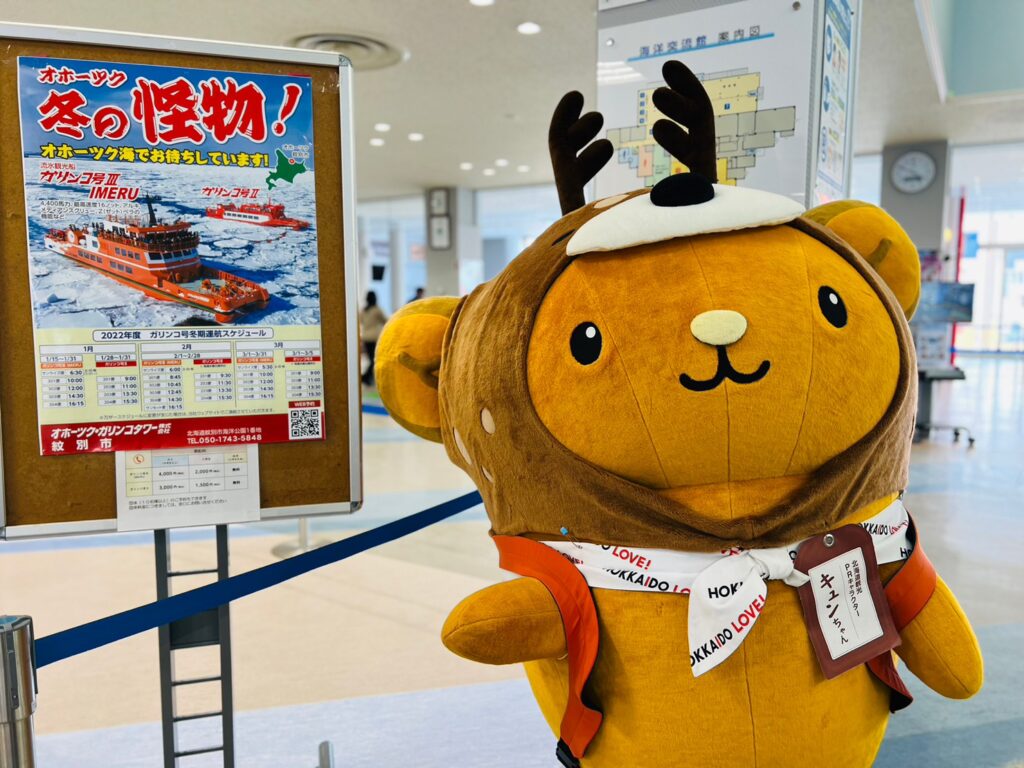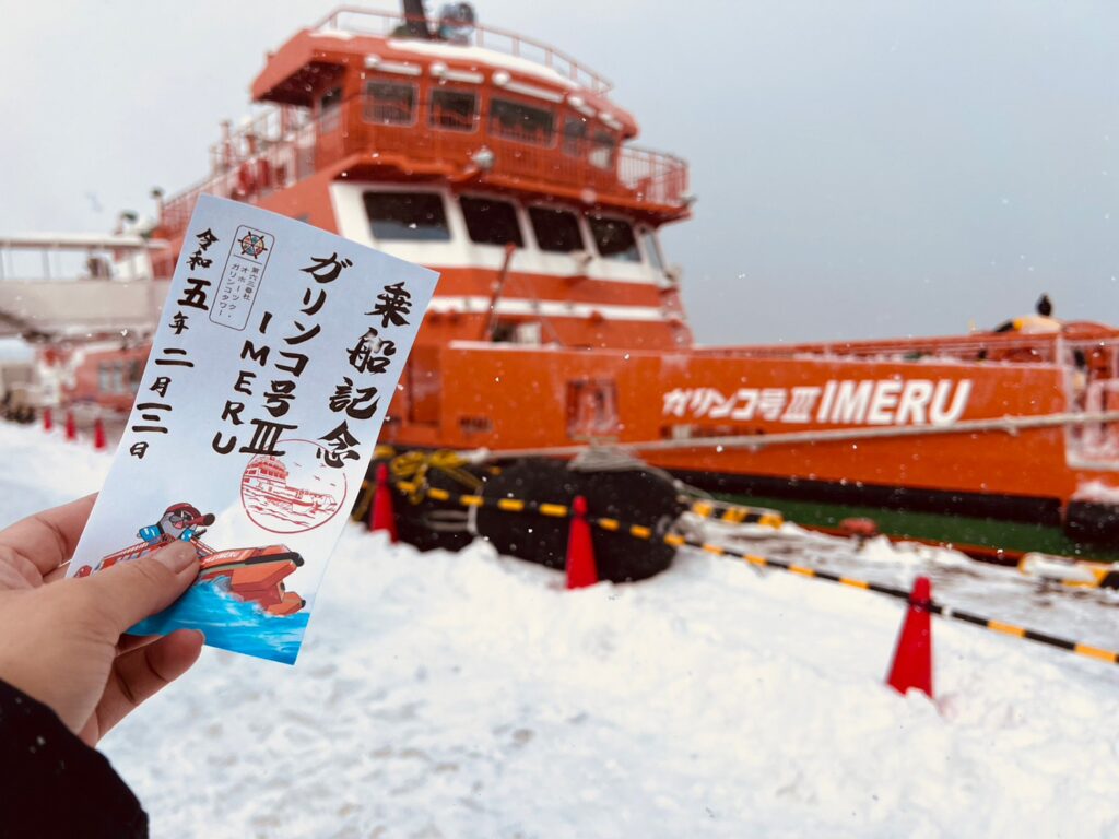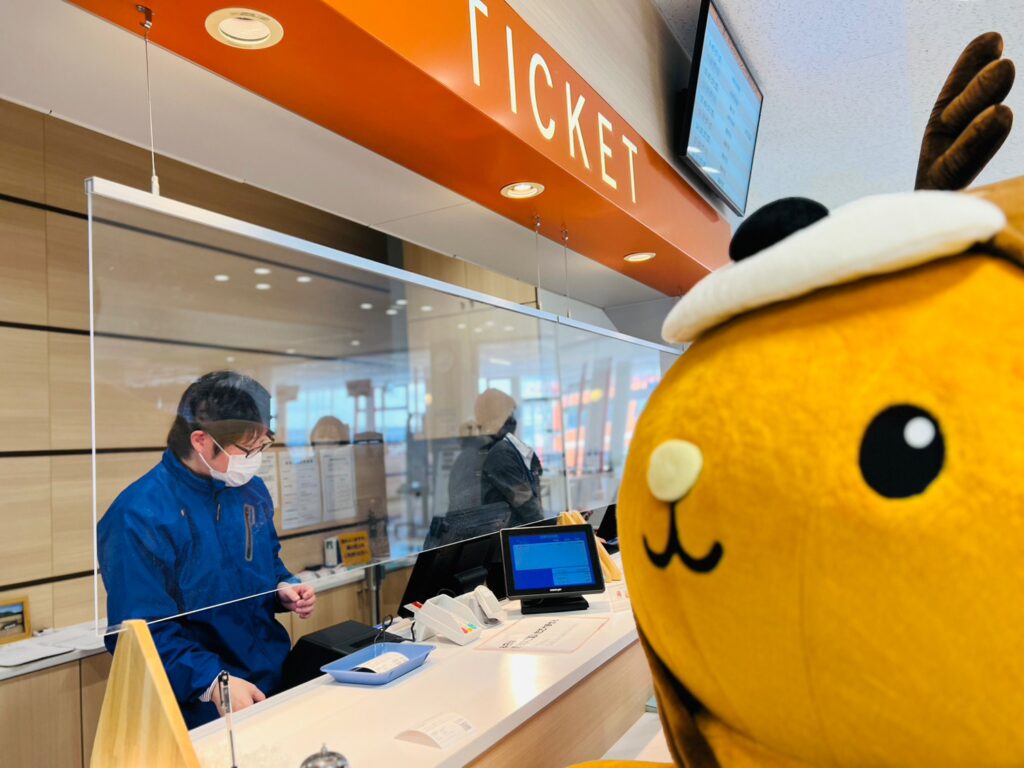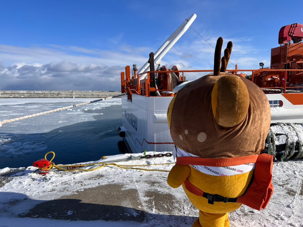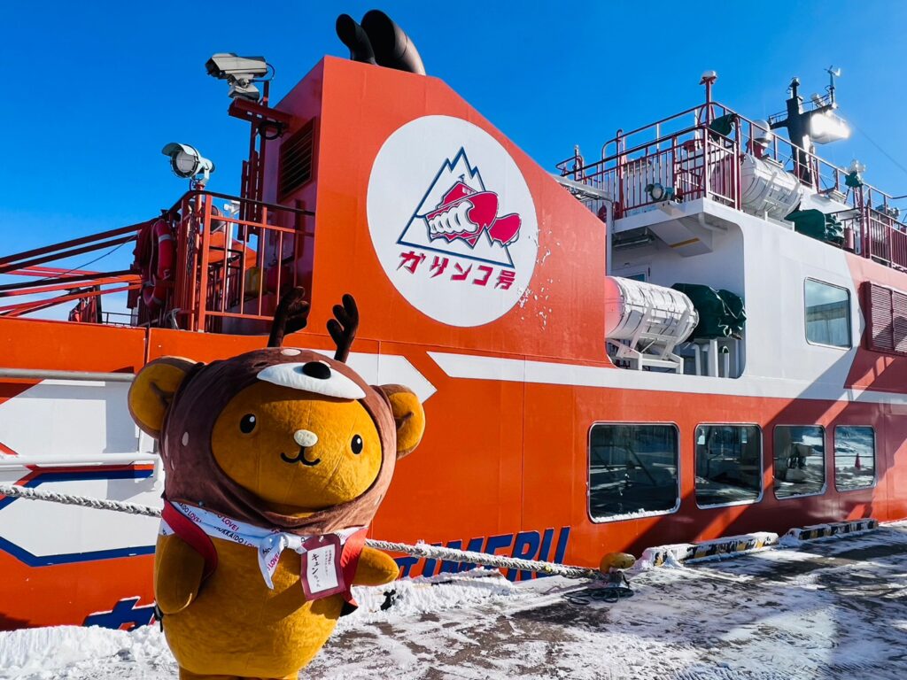 ガリンコ号のスタッフさんが「キュンちゃん、今日は流氷が見られるかもしれないよ!」って教えてくれたのです♪チケットを購入し、さっそく乗船するのです!ワクワク~♪