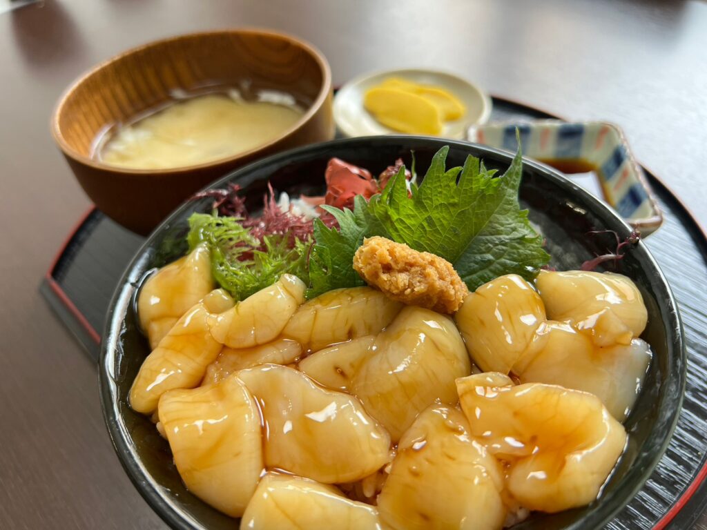 え、ウニかと思ったら違ったホタテ漬け丼だって!新鮮でとってもおいしかったのです♪
