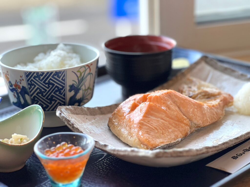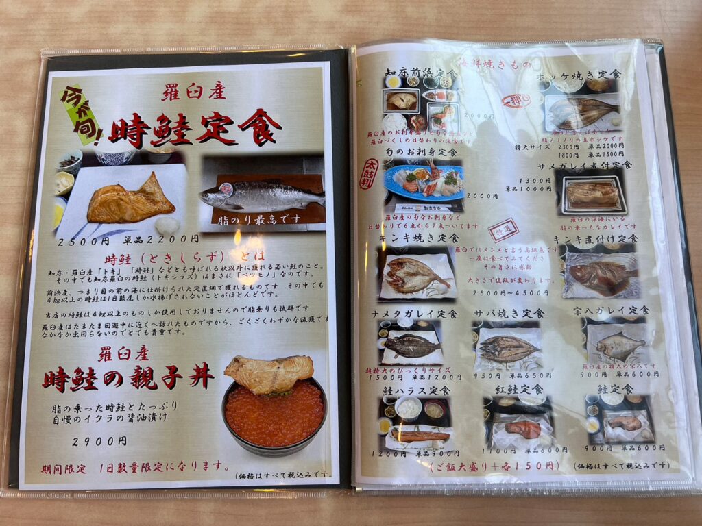 羅臼の初夏の旬、時鮭(ときしらず)。知床食堂の時鮭は4キロ以上の鮭しか使用していないので脂乗りも絶品♪羅臼産の時鮭はたまたま鮭が回遊中に近くを訪れた際に捕獲されるので、ごくわずかしか獲れないみたい。とても貴重だったよ✨