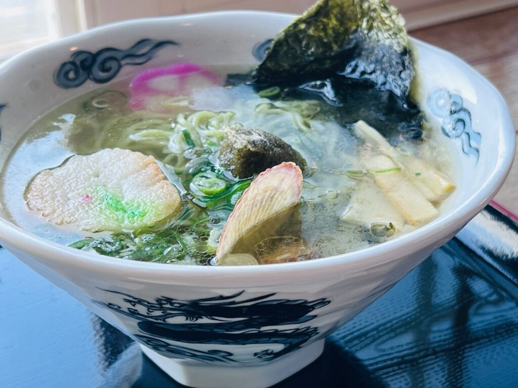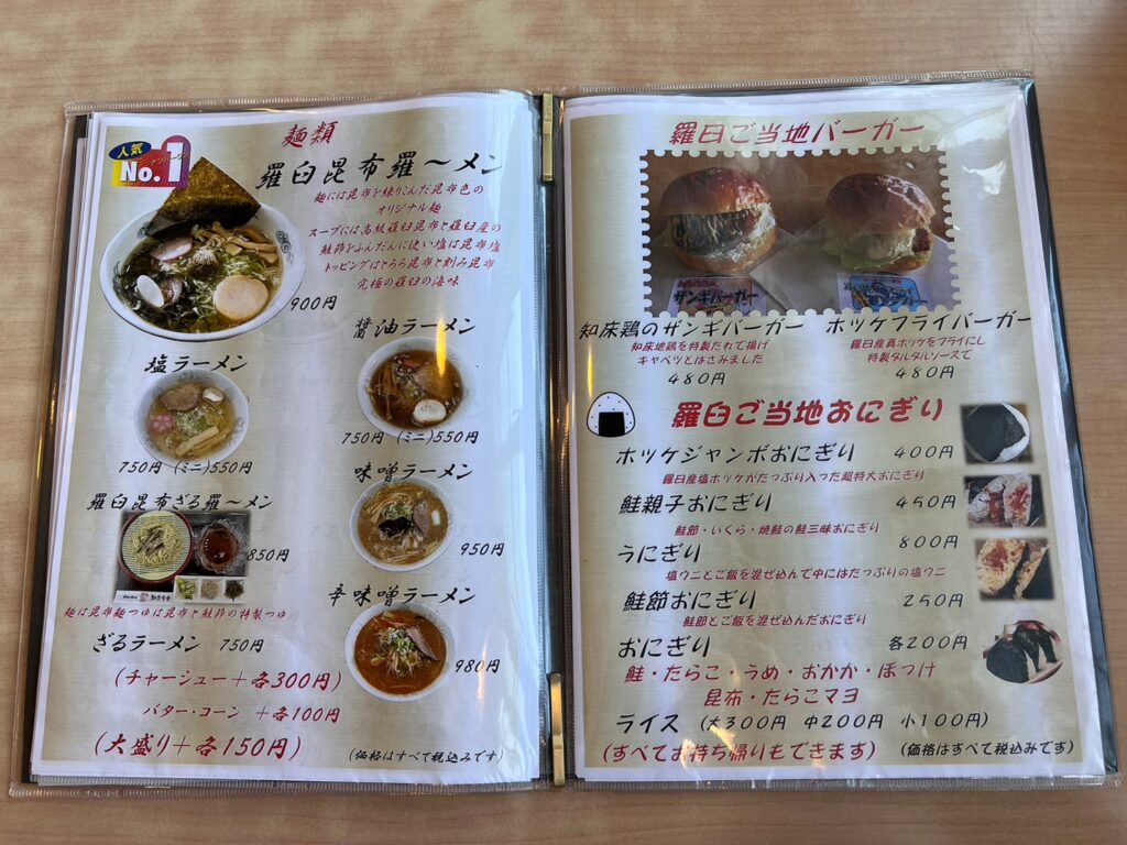 知床食堂の人気メニュー「らうす昆布羅~メン」は、麺に昆布を練り込んだ昆布色のオリジナル麺。スープは高級な羅臼昆布と羅臼産の鮭節を。さらに使用する塩は昆布塩。トッピングにとろろ昆布と刻み昆布・・・もう究極の羅臼を詰め込んだ逸品だね✨