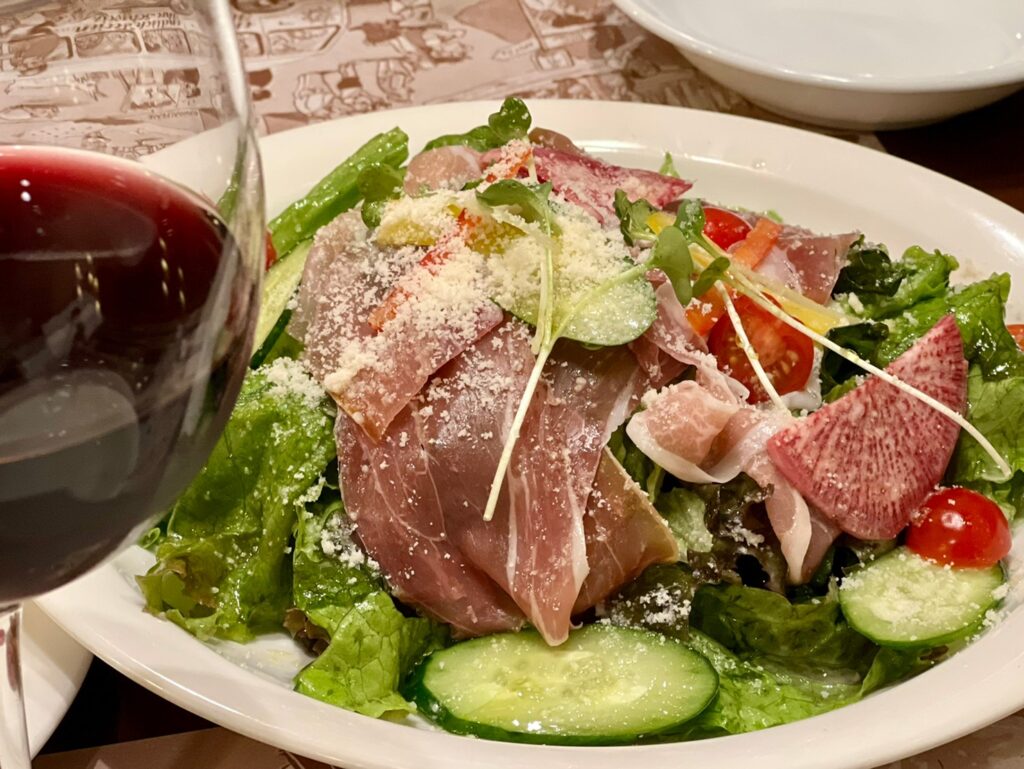 メニューが豊富でとっても迷ったけど、今回はワインも一緒に楽しめる羊料理を中心に、生ハムサラダ・羊のソーセージ、ラムのステーキを注文っ♪