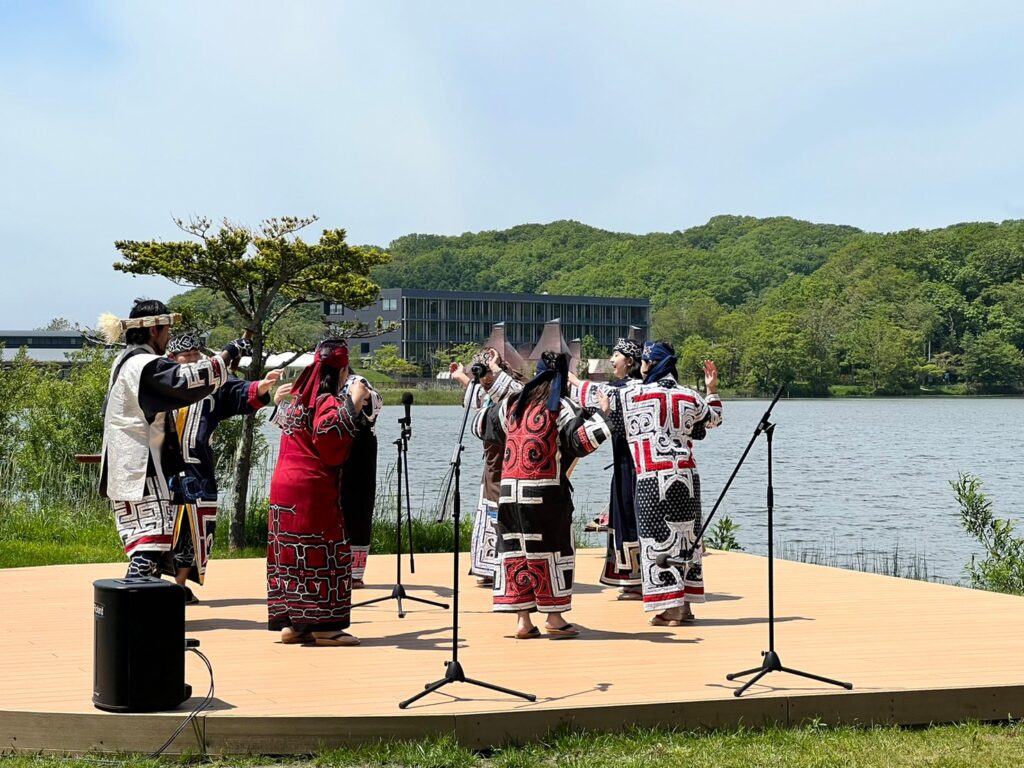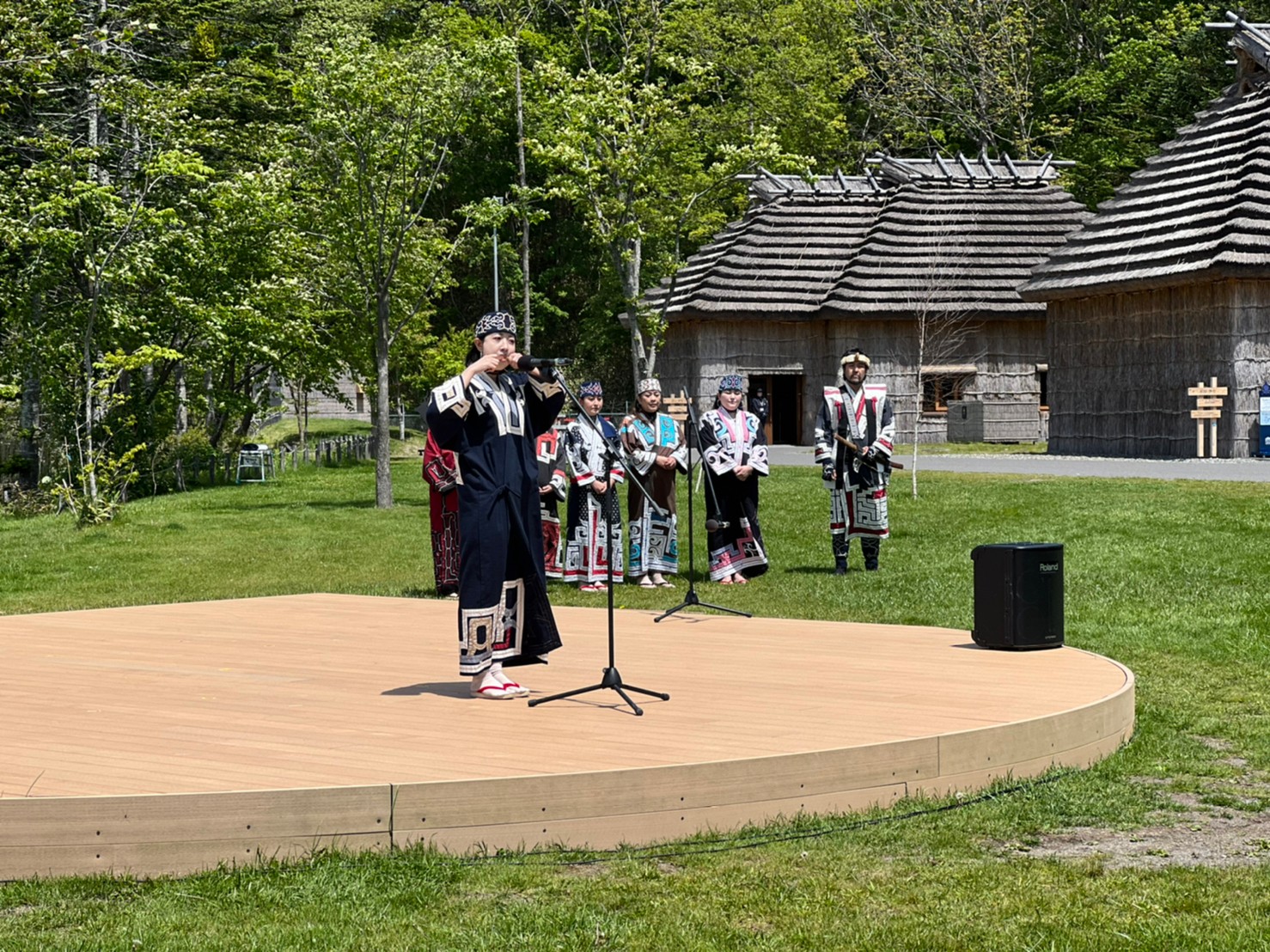 “チセ”を出るとステージでは文化解説プログラム「ウパㇱクマ」が披露されていたよ!コタン(村)での暮らし解説や伝承されてきた歌や踊りを見学できるよ☆