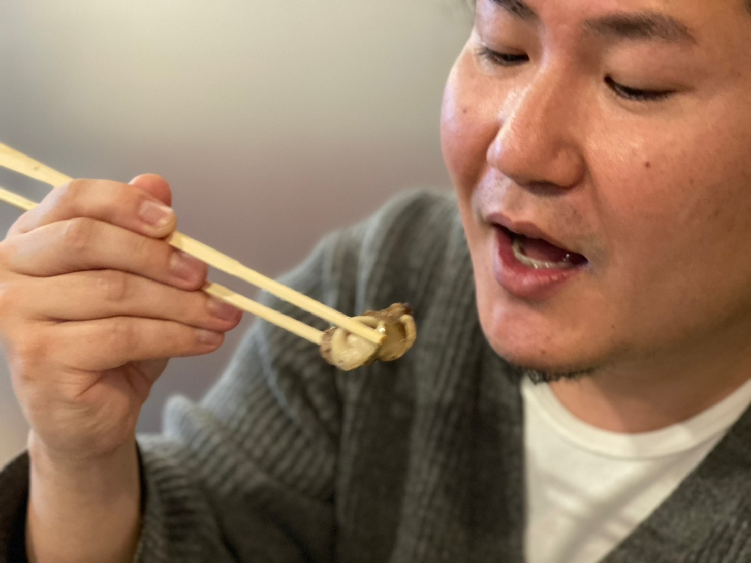 まずは豚タケノコを頂きます!塩コショウは特製で、多めにかけるとより旨味が増すんだって!絶妙な歯ごたえがたまらない♪ご飯が進みます~!